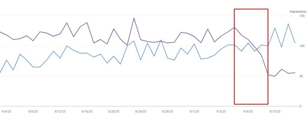 3) Many sites saw impressions fall and average position improve from about September 10 onward. The most widely supported theory is that bots loading 100-result pages used to generate impressions that counted in GSC. Now that Google no longer supports that parameter, those bot-driven impressions have been reduced.